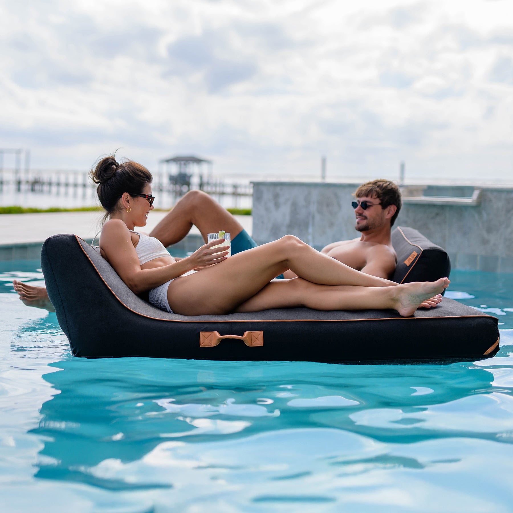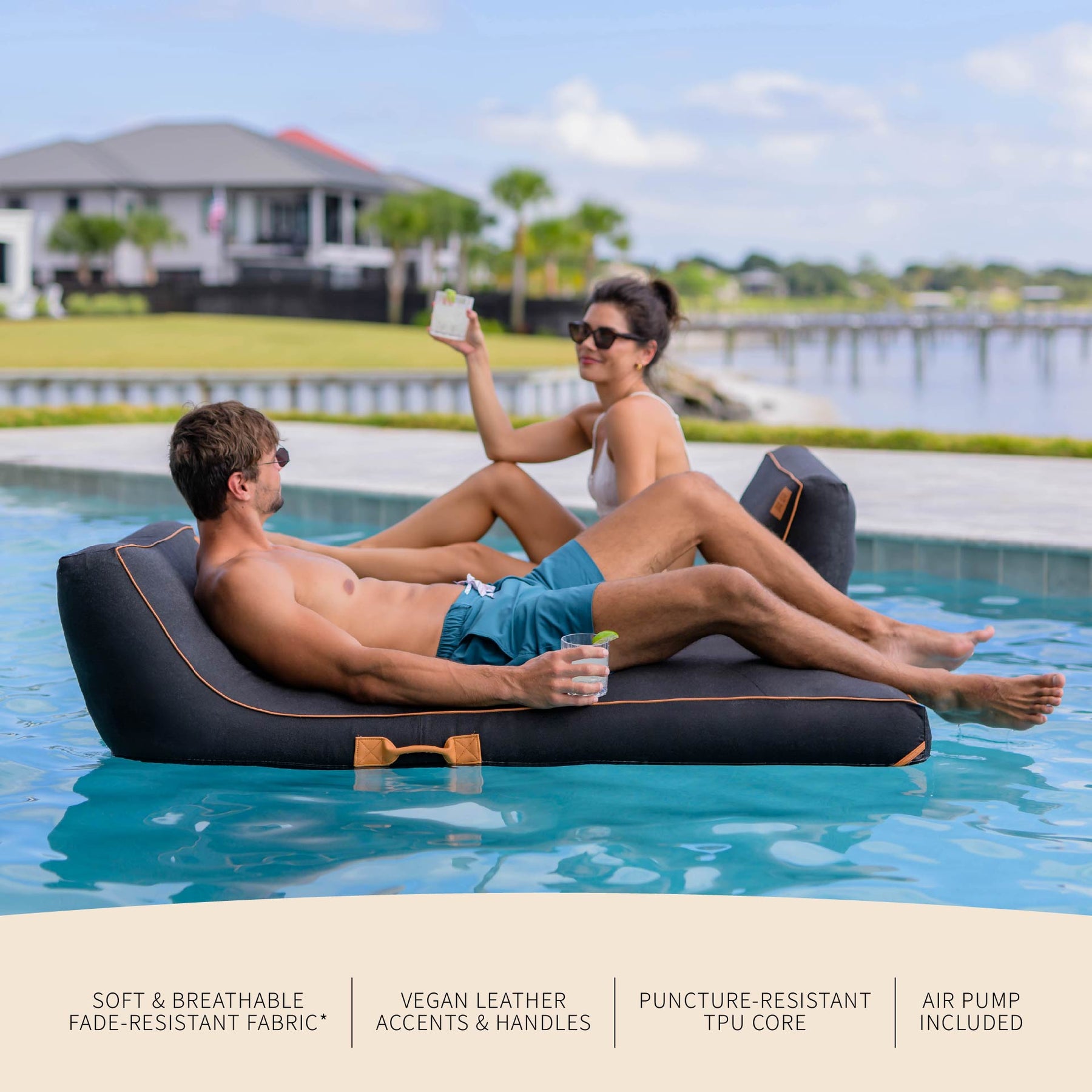 Leave the kiddie floats behind and step into a more elevated way to lounge. The Lux Inflatable Chaise Pool Lounger with Sunbrella® Fabric is a premium inflatable body float designed for grown up pool days and long-lasting outdoor performance. Wrapped in genuine Sunbrella® performance fabric with a 5-year fade protection guarantee**, it delivers exceptional durability with a soft, upholstery-like feel that stays comfortable against your skin. Choose from Twilight™, Sand and Stripe, and Blue Harbor to find the look that best reflects your style. A removable, washable cover, elevated vegan leather accents, and easy travel handles add thoughtful details, while the supportive inflatable core keeps you floating comfortably atop the water. This is pool lounging that looks refined—and is built to last.